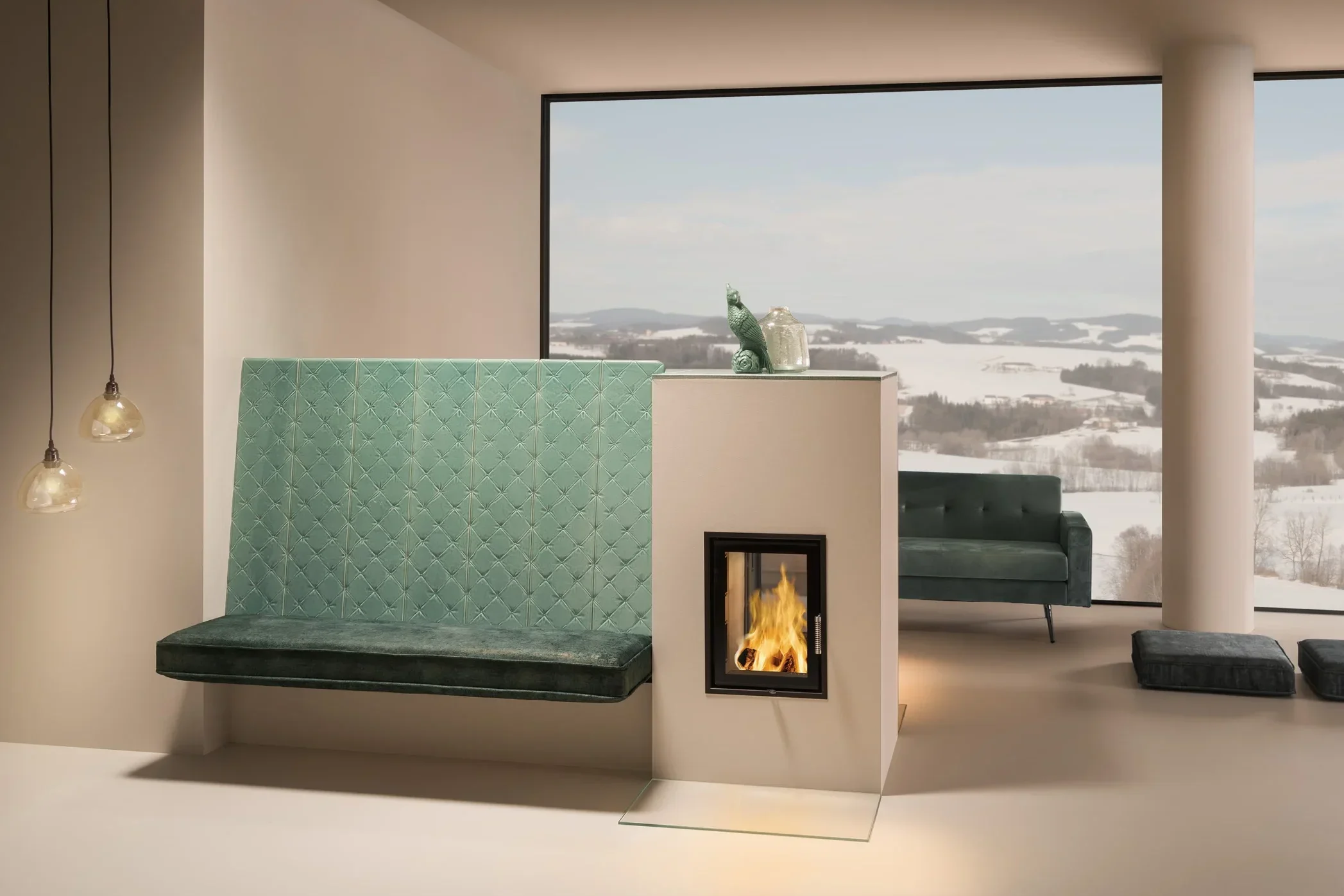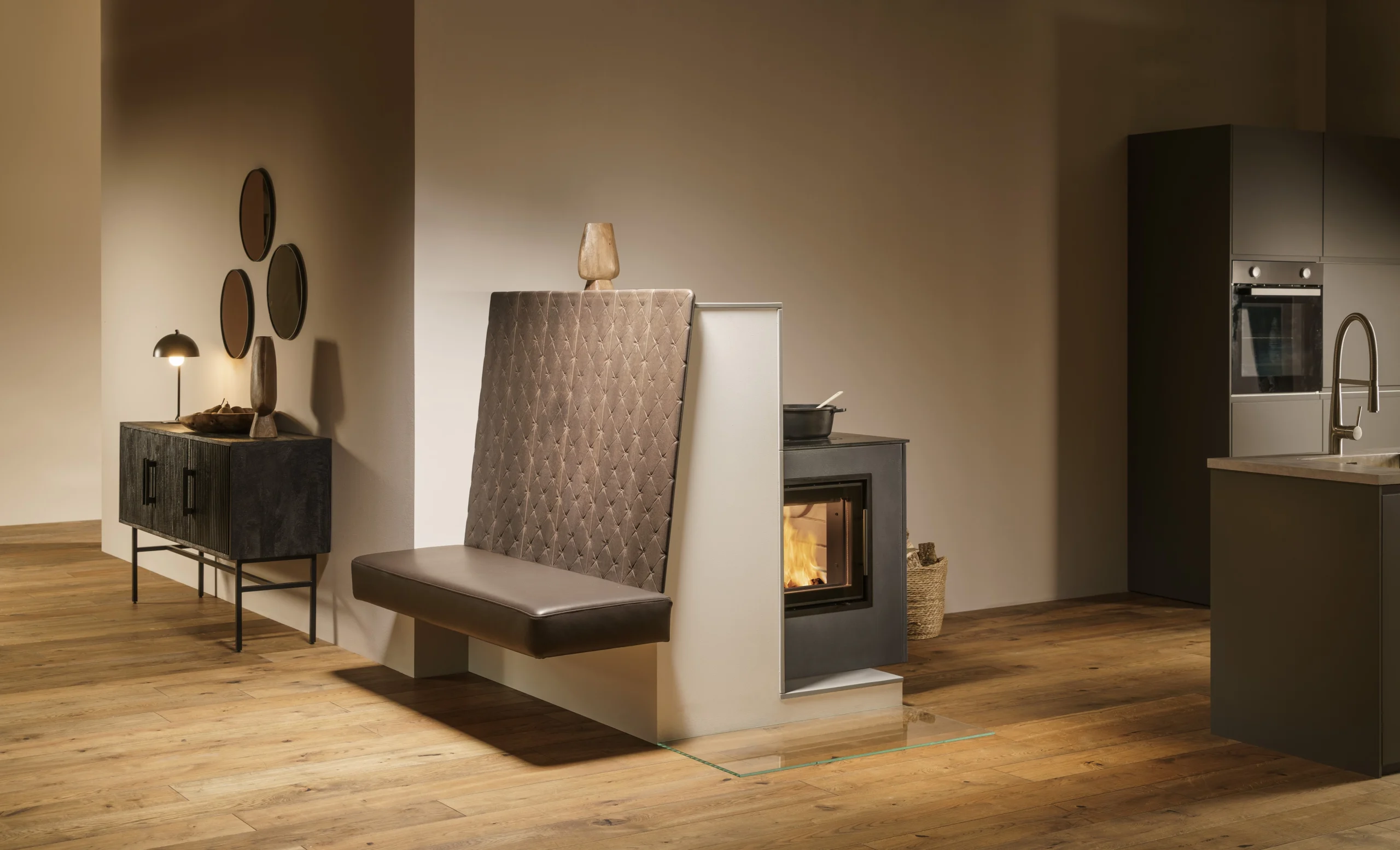Große Sichtscheiben, schnelle Wärmeabgabe und klare Linien. Auf Wunsch als Eck-, Tunnel- oder Panoramakamin, kombinierbar mit Speichermodulen und Sitzbänken.